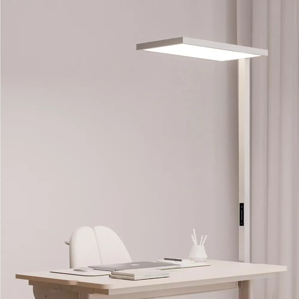 而铂学全光谱学习落地灯模拟早上9点清晨的太阳光,干净清爽的中性色温,温暖而自然。微棱镜扩散光学设计,具有三重防眩光,无蓝光 无频闪,上下立体双光源 360°阳光光效,轻触滑动可进行无极调光等特点。